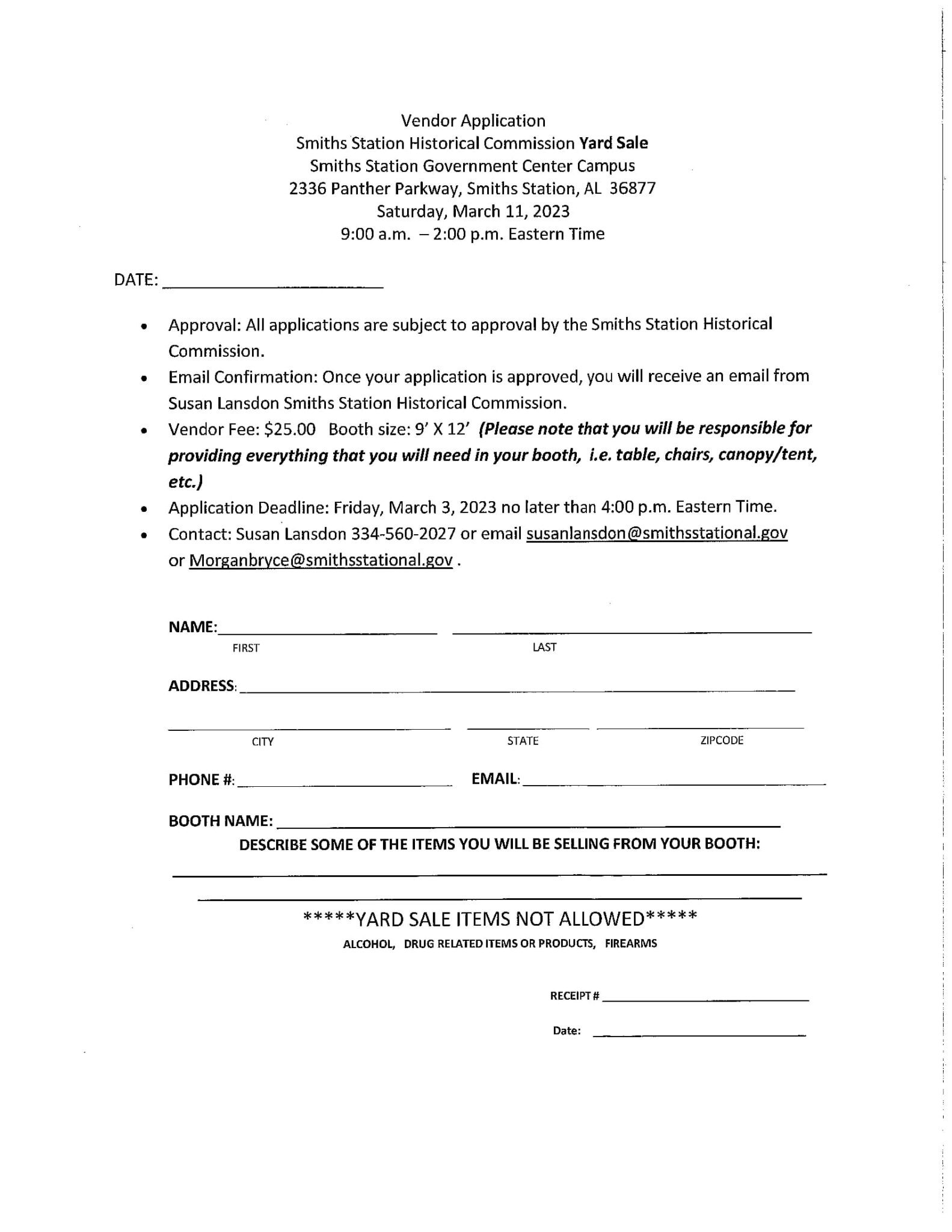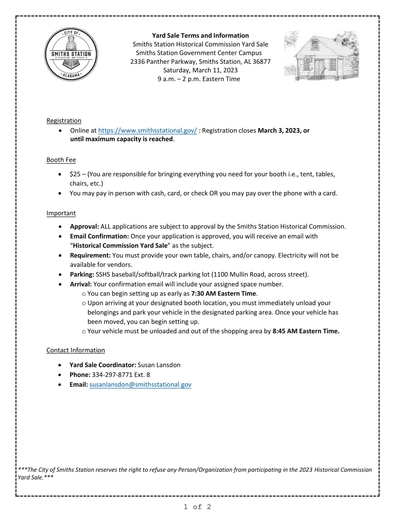 Wanting to clean or declutter your home? Look no further than the City of Smiths Station Historical Commission’s Inaugural Yard Sale at City Hall on Saturday, March 11, 2023 from 9 a.m. to 2 p.m. Eastern.